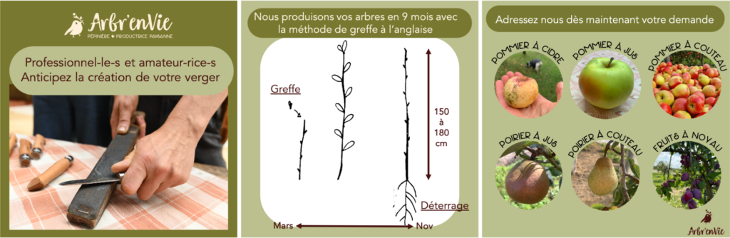 Les fruitiers sont élevés en pleine terre 1 à 2 ans max sous forme de scion (grande tige souple) et vendus en racine nue.